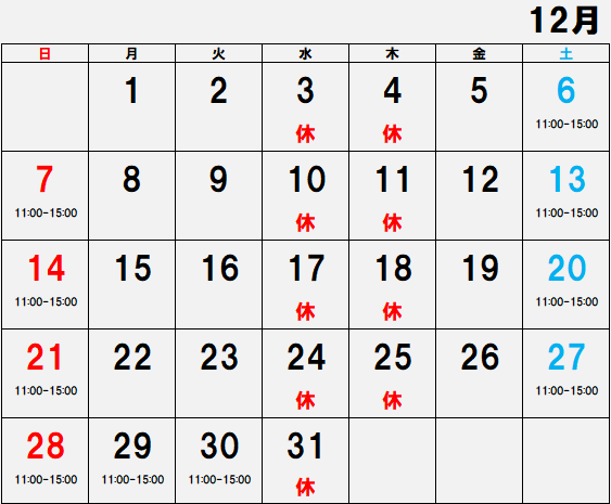 12月3日(水)・4日(木)・10(水)・11(木)・17日(水)・18日(木)・24日(水)・25日(木)・31日(水)は休業とさせていただきます。