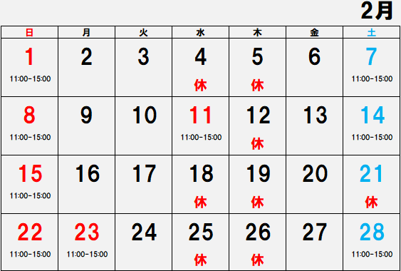 2月4日(水)・5日(木)・12日(木)・18(水)・19(木)・21日(土)・25日(水)・26日(木)は休業とさせていただきます。